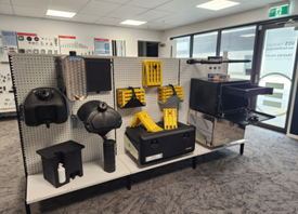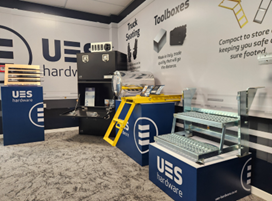 Indoor display at UES Hardware New Zealand showcasing new product innovations like the foldable wheel chocks and the 90 second install EVO toolboxes supplied to local industry customers.